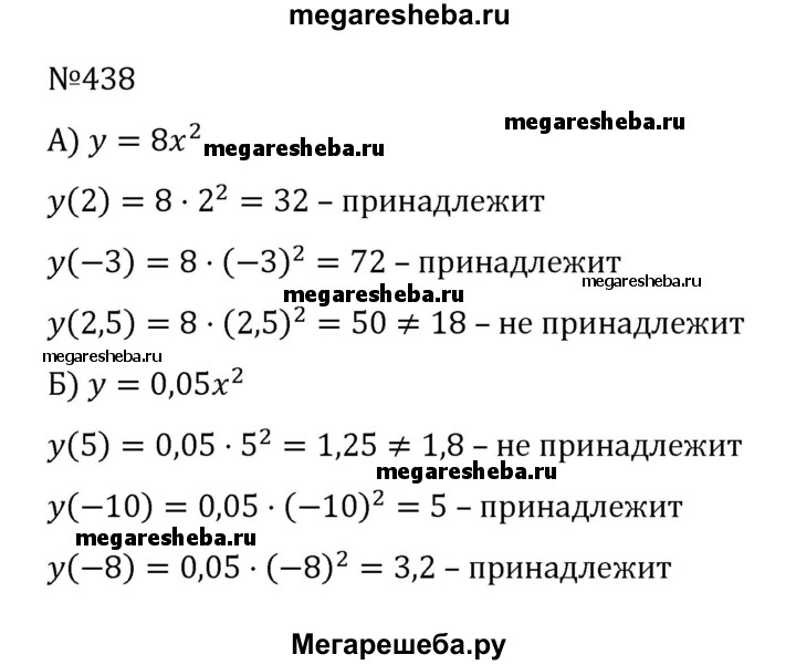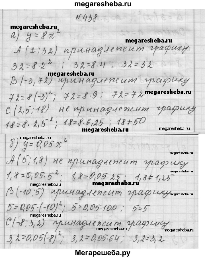 438. Принадлежат ли графику функции: а) у = 8х2 точки А(2; 32), В(-3; 72), С(2,5; 18); б) у = 0,05x2 точки А(5; 1,8), В (-10; 5), С(-8; 3,2)?