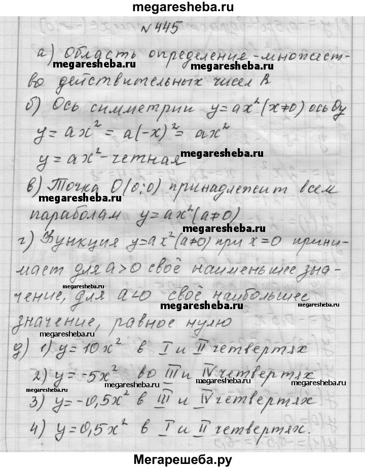 445. а) Какова область определения функции у = ах2 (а ≠ 0)? б) Докажите, что функция у = ах2 (а ≠ 0) чётная. Укажите ось симметрии графика функции. в) Существуют ли точки, принадлежащие всем параболам вида у = ах2 (а ≠ 0)? г) Принимает ли функция у = ах2 (а ≠ 0) свои наибольшее и наименьшее значения? д) В каких четвертях расположен график функции: 1) у = 10х2; 2) у = -5x2; 3) у = -0,5х2; 4) у = 0,5х2?