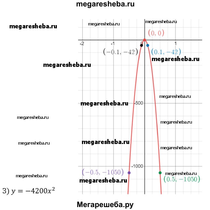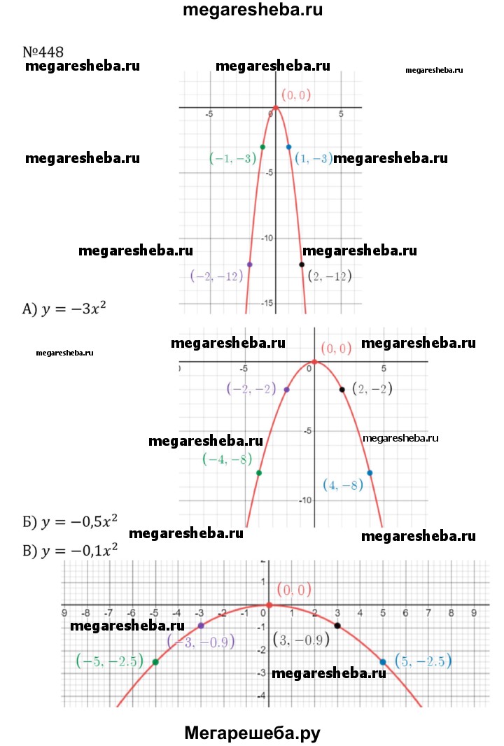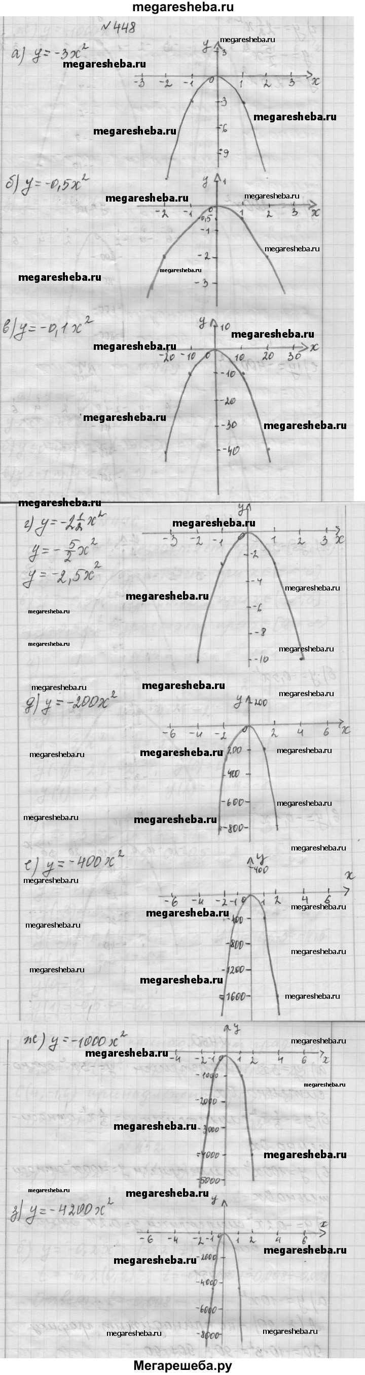 448. Постройте график функции, выбрав удобные единичные отрезки: а) у = -Зх2; б) у = -0,5х2; в) у =-0,1х2; г) у = -2*1/2х2; д) у = -200x2; е) у = -400х2; ж) у = -1000x2; з) у = -4200x2.