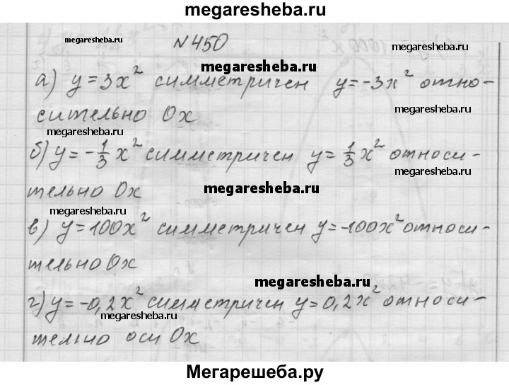 450. Какой формулой задана функция, график которой симметричен относительно оси Ох графику функции: а) у = Зх2; б)у = -1/3х2; в) у = 100х2; г) у = -0,2x2?