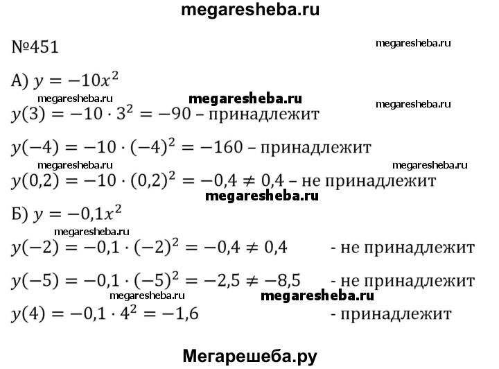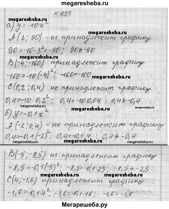 451. Принадлежат ли графику функции: а) у = -10x2 точки А(3; 90), В(-4; -160), С(0,2; 0,4); б) у = -0,1x2 точки А (-2; 0,4), В(-5; -8,5), С(4; -1,6)?