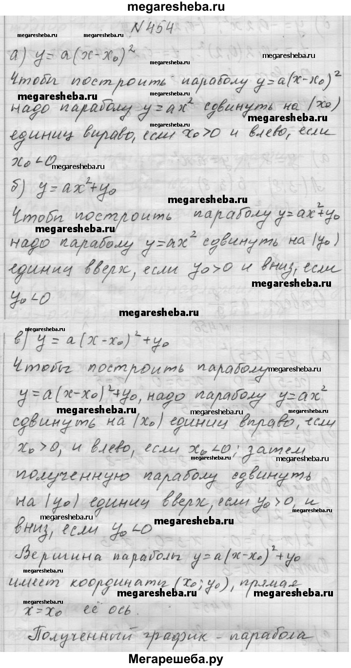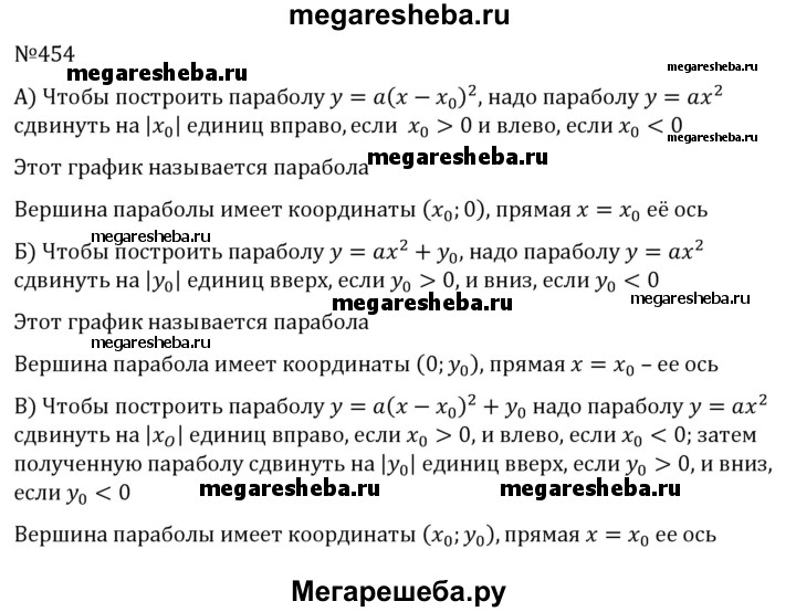 454. Как, используя график функции у = ах2 (а ≠ 0), построить график функции: а) у = а(х - х0)2; б) у = ах2 + у0; в) у = а(х - х0)2 + у01 Как называют эти графики? Какие точки являются их вершинами? Каковы уравнения их осей?