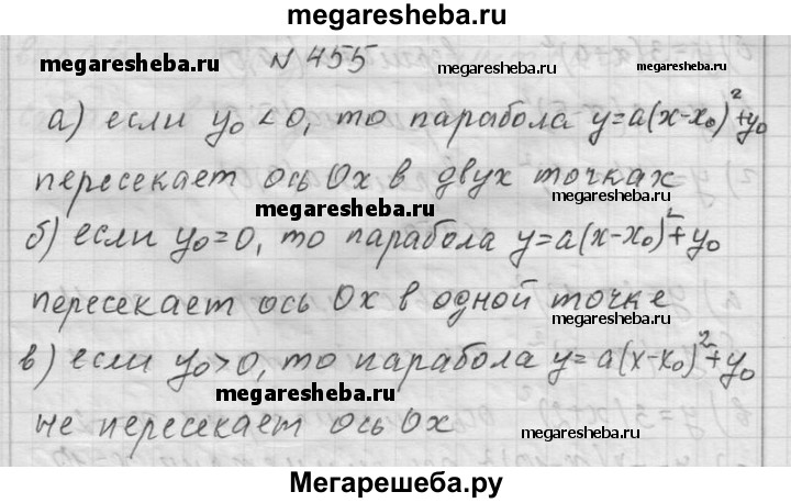 455. Пусть а > 0. Каким должно быть число у0, чтобы парабола у = а (х - х0)2 + у0: а) пересекала ось Ох в двух точках; б) пересекала ось Ох в одной точке; в) не пересекала ось Ох?
