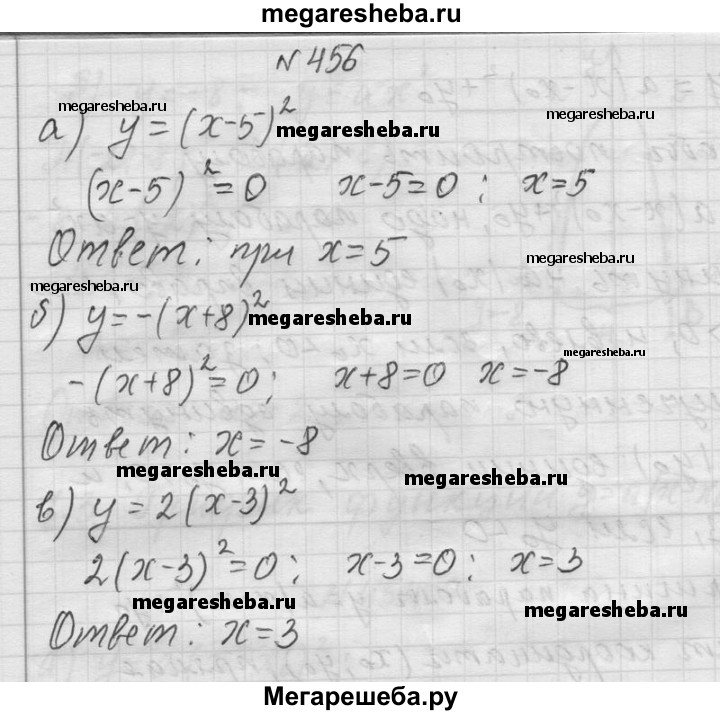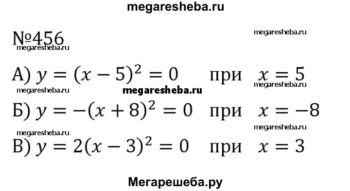 456. При каких значениях х равно нулю значение функции: а) у = (х - 5)2; б) у = -(х + 8)2; в) у = 2(х - З)2?