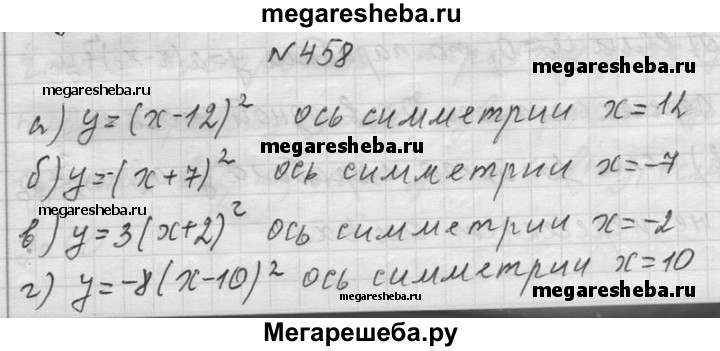 458. Запишите уравнение оси симметрии параболы: а) у = (х - 12)2; б) у = -(х + 7)2; в) у = 3(х + 2)2; г) у = -8(х - 10)2.