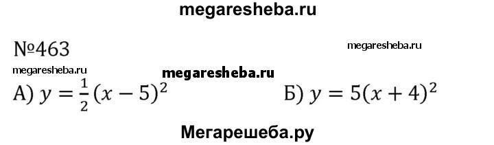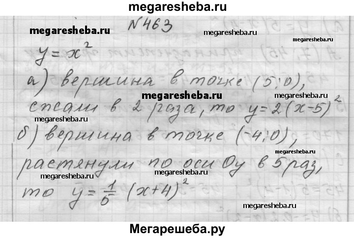 463. Какой формулой задана функция, график которой получен из параболы у = х2 с помощью: а) сжатия по оси Оу в 2 раза и переноса вершины в точку (5; 0); б) растяжения по оси Оу в 5 раз и переноса вершины в точку (-4; 0)??