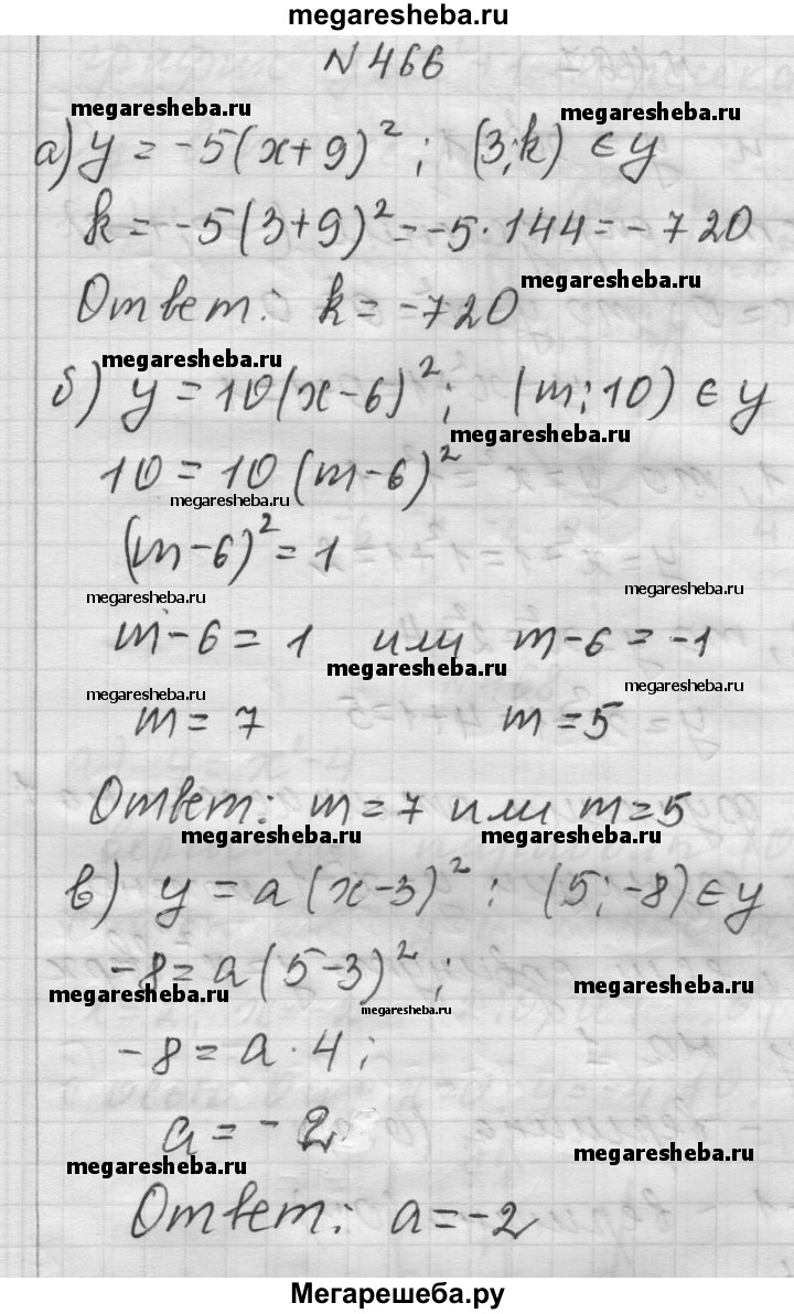 466. а) Дана функция у = -5(х + 9)2. Точка (3; k) принадлежит графику этой функции. Определите k. б) Дана функция у = 10 (х - б)2. Точка (m; 10) принадлежит графику этой функции. Определите m. в) Точка (5; -8) принадлежит графику функции у = а(х - З)2. Определите а.