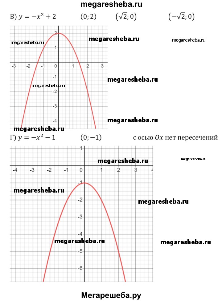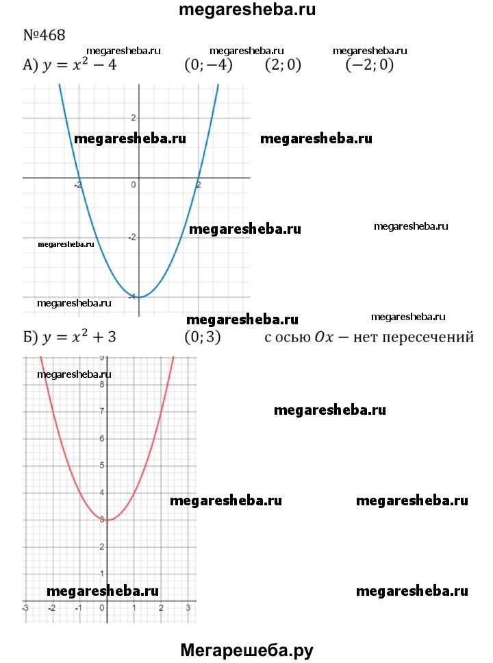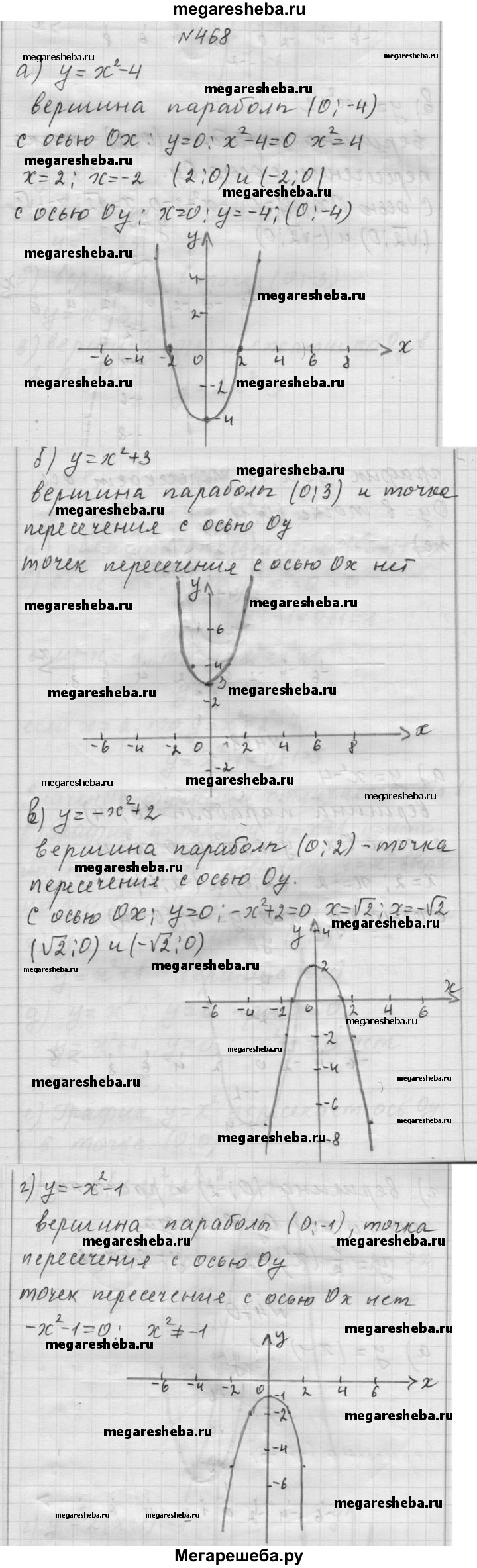 468. Постройте график функции, предварительно указав координаты вершины параболы и точек пересечения графика с осями координат, если они существуют: а) у = х2 - 4; б) у = х2 + 3; в) у =-х2 + 2; г) у =-х2 - 1.