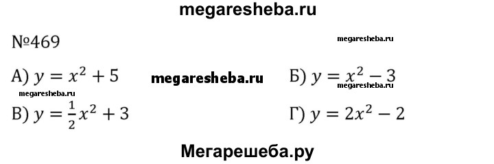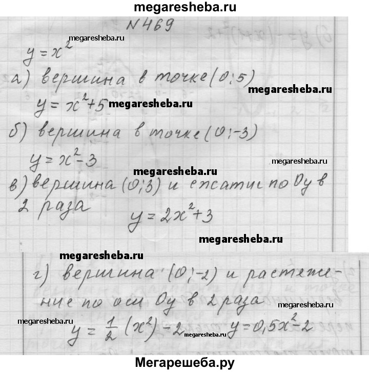 469. Какой формулой задана функция, график которой получен из параболы у = х2 в результате: а) переноса вершины в точку (0; 5); б) переноса вершины в точку (0; -3); в) сжатия по оси Оу в 2 раза и переноса вершины в точку (0; 3); г) растяжения по оси Оу в 2 раза и переноса вершины в точку (0; -2)?