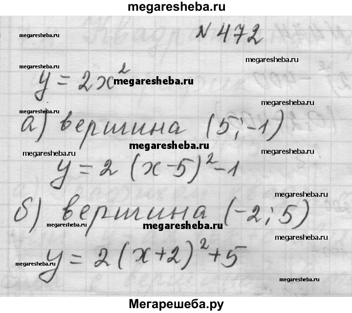 472. Какой формулой задана функция, график которой получен параллельным переносом параболы у = 2x2 так, что её вершина есть точка: а) (5; -1); б) (-2; 5)?