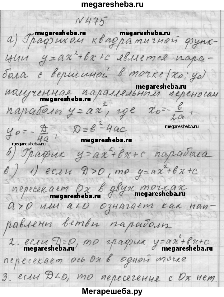 475. а) Как построить график функции у = ах2 + bх + с (а ≠ 0), используя график функции у = ах2? б) Как называют график функции у = ах2 + bх + с (а ≠ 0)? в) Как расположен относительно оси Ох график функции у = ах2 + bх + с при а > 0 (при а < 0), если: 1) D > 0; 2) D = 0; 3) D < 0?