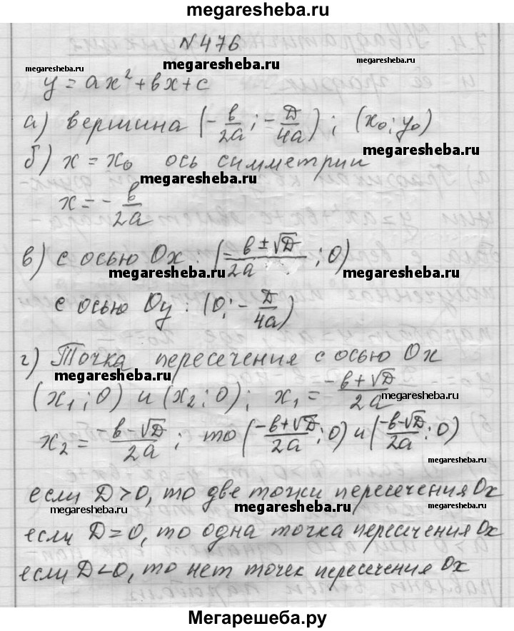 476. Дана квадратичная функция у = ах2 + bх + с. Для её графика — параболы — укажите: а) координаты вершины; б) уравнение оси симметрии; в) координаты точки пересечения с осью Оу, г) координаты точек пересечения с осью Ох и условия, от которых зависит число таких точек.