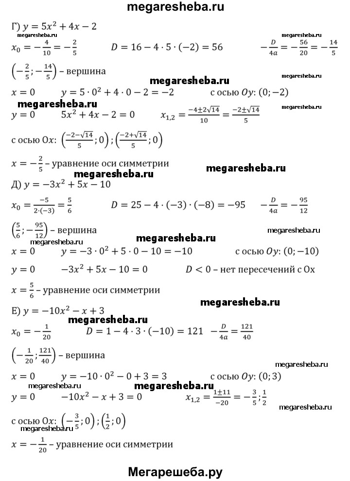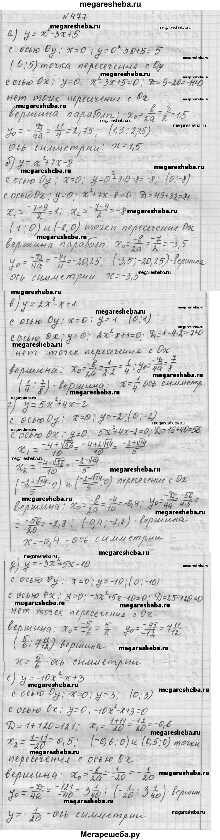 477. Укажите координаты вершины, уравнение оси симметрии параболы, координаты точек пересечения параболы с осями координат, если парабола — график функции: