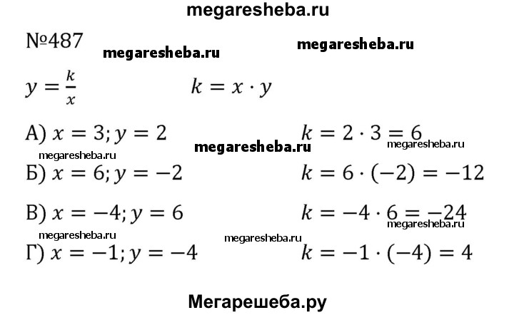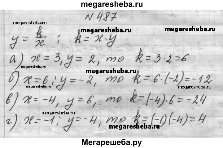 487. Определите коэффициент пропорциональности k для функции у = k/x, если значению аргумента х соответствует значение функции у: а) х = 3, у = 2; б) х = 6, у = -2; в) х = -4, у = 6; г) х = -1, у = -4.?