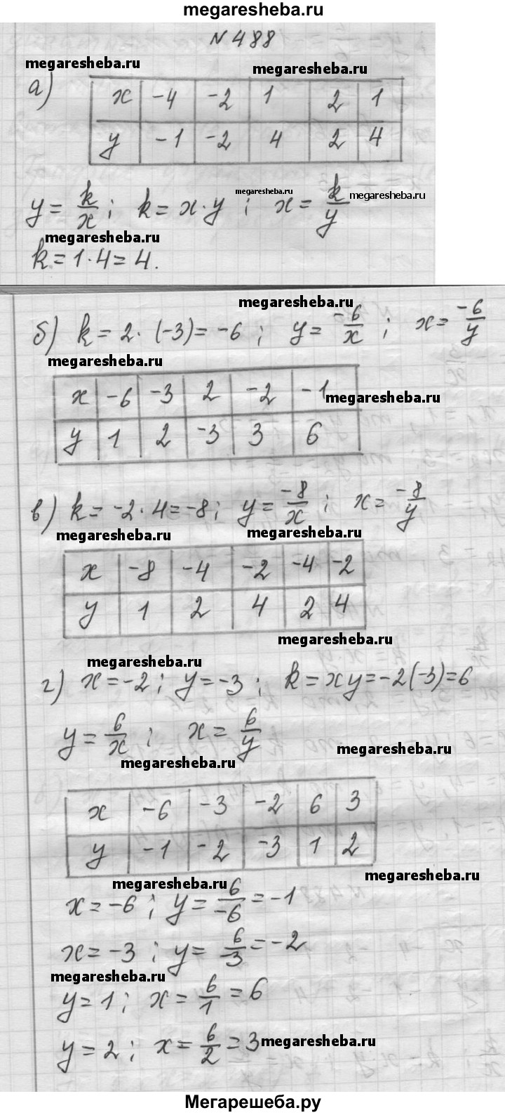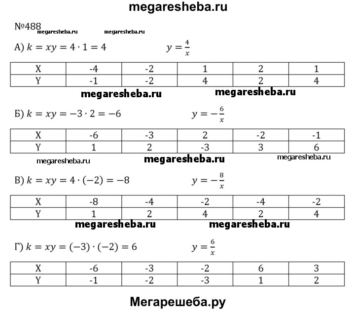 488. Определите коэффициент пропорциональности к для функции к у = k/x и заполните таблицу её значений: