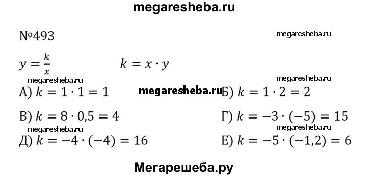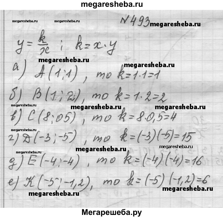 493. Определите k для гиперболы у = k/x, проходящей через точку: а) А(1; 1); б) В(1; 2); в) С(8; 0,5); г) D(-3; -5); д) Е(-4; -4); е) К(-5; -1,2)?