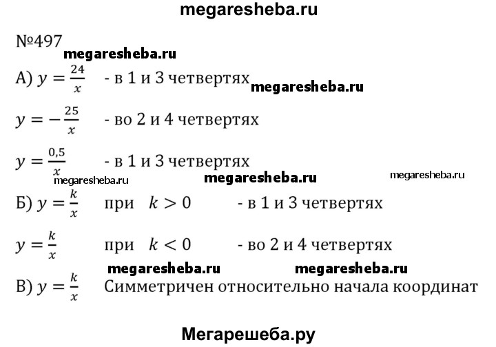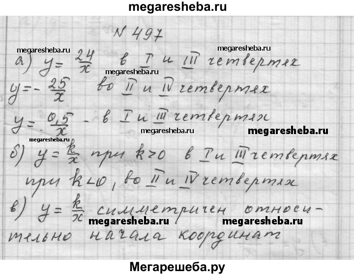497. а) В каких четвертях расположен график функции: у = 24/x; y = 25/x; y = 0,5/x б) В каких четвертях расположен график функции у = k/x, при k > 0? при k < 0? в) Относительно чего — начала координат или оси Оу — симметричен график функции у = k/x ?