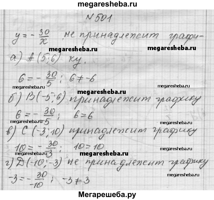 501. Принадлежит ли гиперболе у = -30/x точка: а) А(5; 6); б) В(-5; 6); в) С(-3; 10); г) D( -10; -3)?