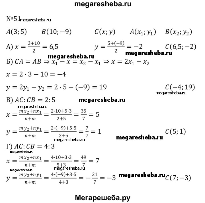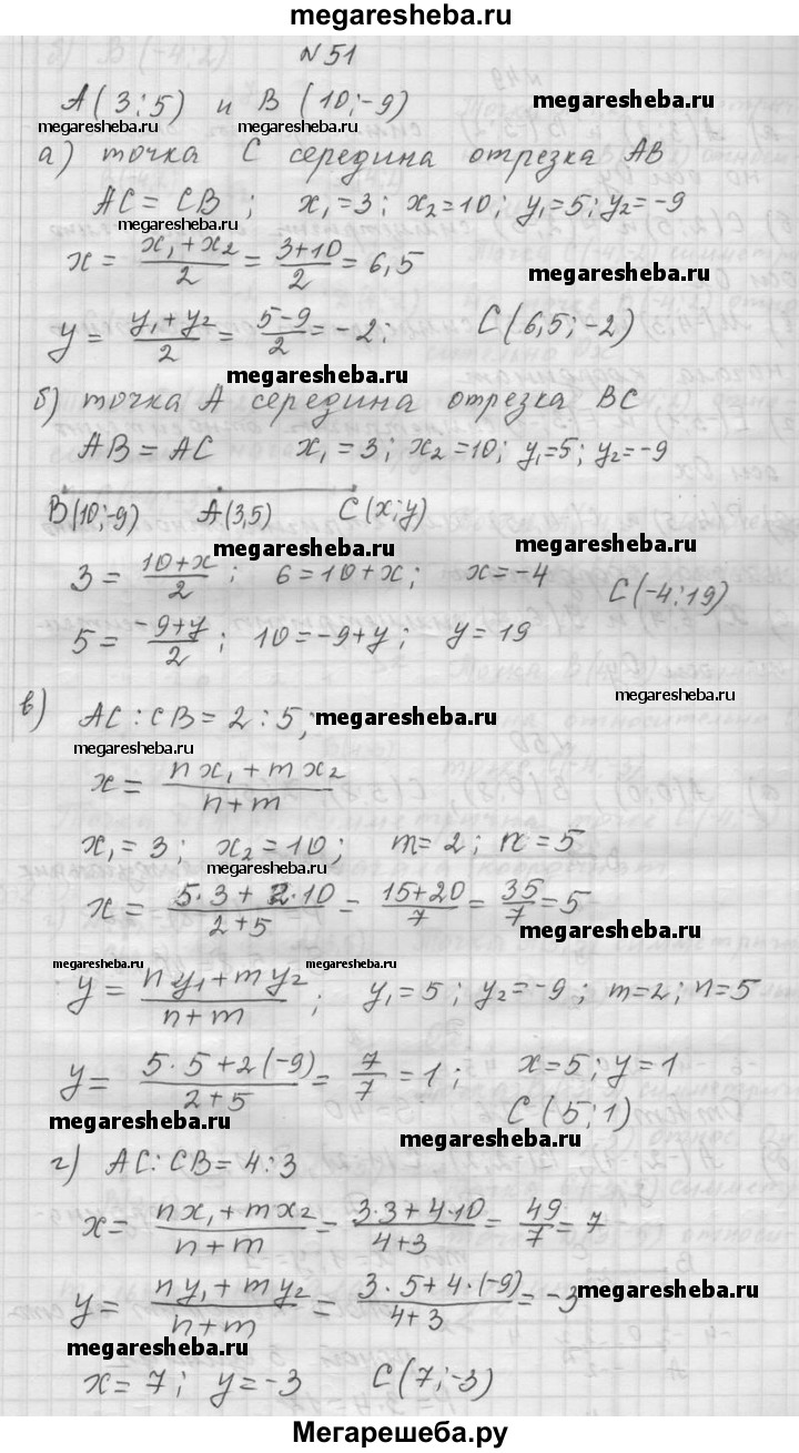 51. Даны точки А(3; 5) и В (10; -9). Определите координаты точки С, если: а) С — середина отрезка АВ; б) А — середина отрезка ВС; в) АС : СВ = 2 : 5; г) АС : СВ = 4 : 3.