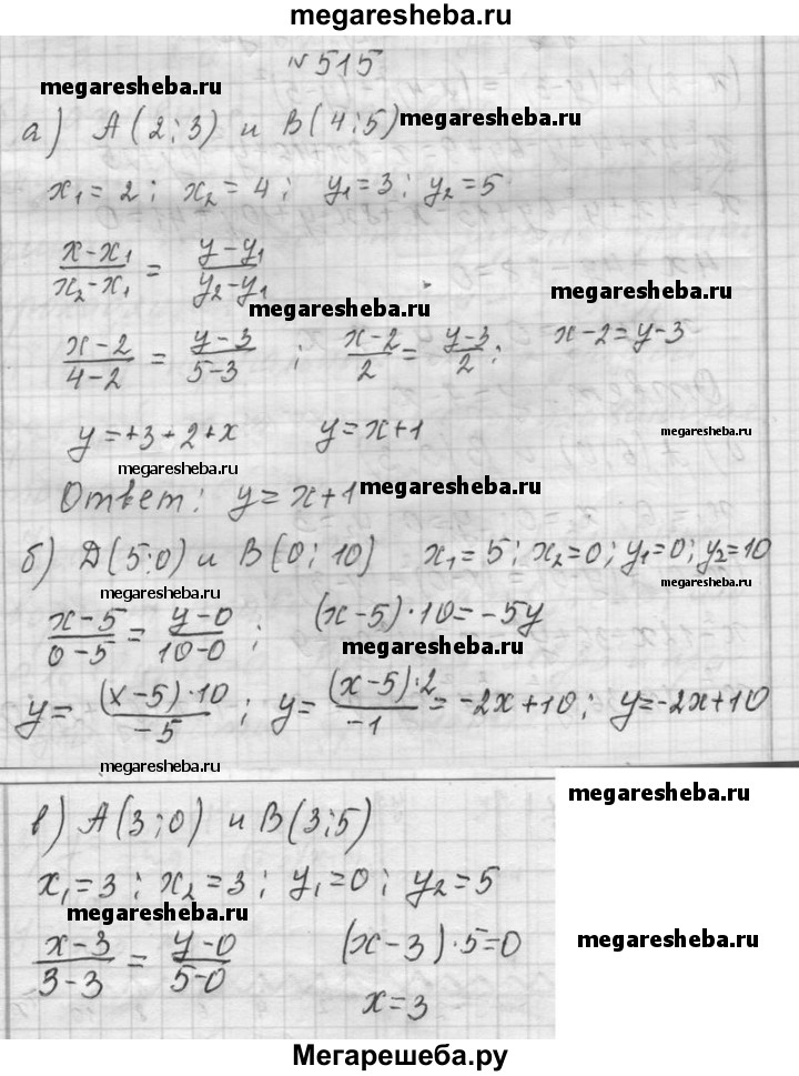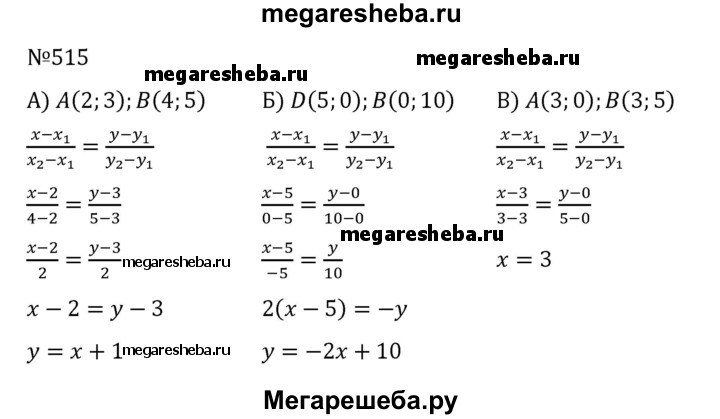 515. Напишите уравнение прямой, проходящей через точки: а) А(2; 3) и В(4; 5); б) D(5; 0) и В(0; 10); в) А(3; 0) и В(3; 5).