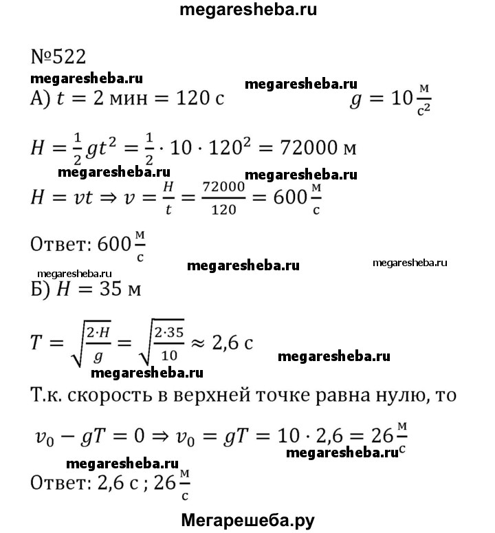 522. Исследуем, а) Выясните, с какой скоростью должна вылететь пуля из винтовки вверх, чтобы упасть на землю приблизительно через 2 мин. б) Стрела, выпущенная из лука вертикально вверх, поднялась на 35 м. Через какое время она достигнет наибольшей высоты подъёма? Через какое время стрела упадёт на землю? Определите начальную скорость стрелы.