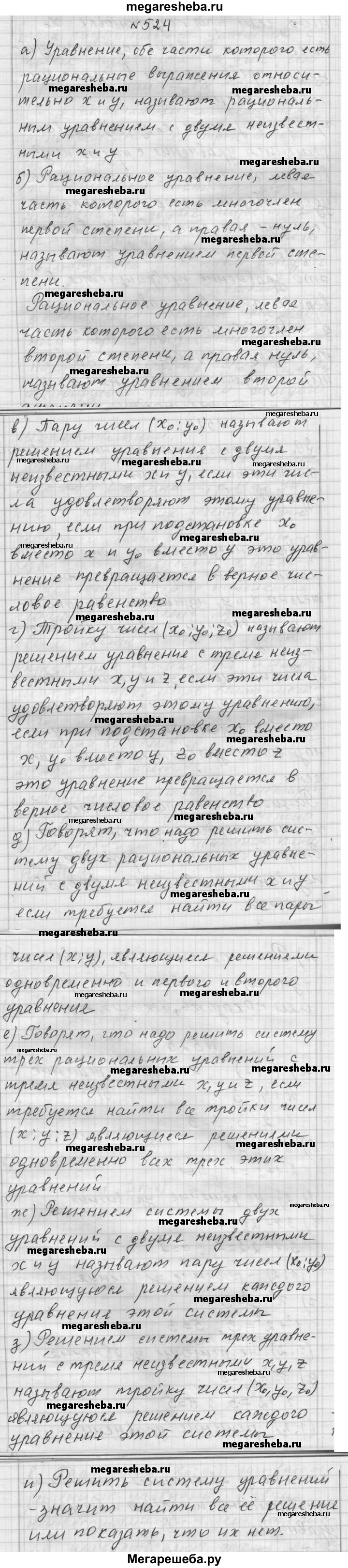 524. а) Какое уравнение называют рациональным уравнением? б) Какое уравнение называют уравнением первой степени? второй степени? в) Что называют решением уравнения с двумя неизвестными х и у? г) Что называют решением уравнения с тремя неизвестными х, у и z? д) Когда говорят, что надо решить систему двух уравнений с двумя неизвестными? е) Когда говорят, что надо решить систему трёх уравнений с тремя неизвестными? ж) Что называют решением системы двух уравнений с двумя неизвестными? з) Что называют решением системы трёх уравнений с тремя неизвестными? и) Что значит решить систему уравнений?
