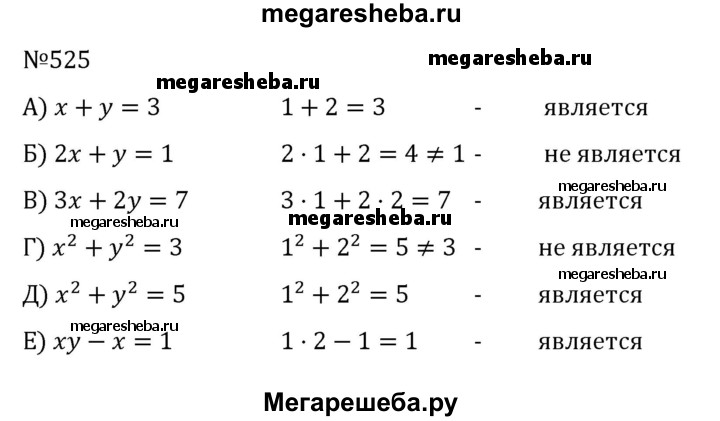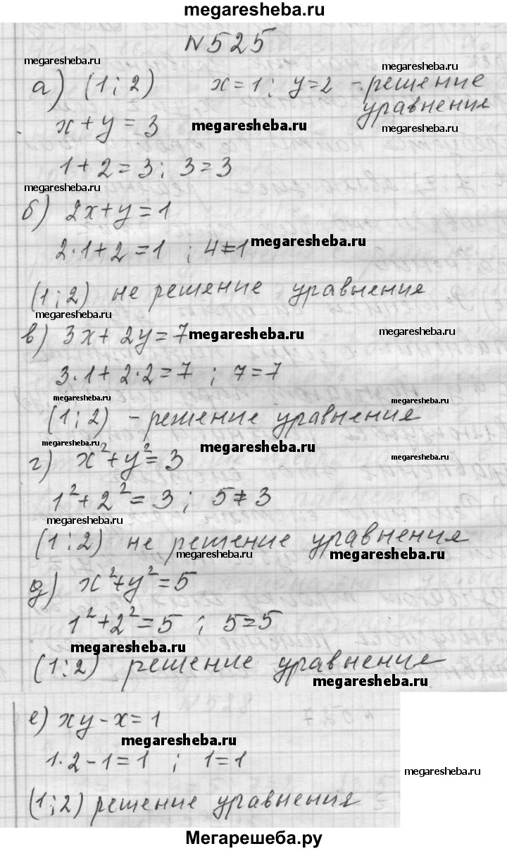 525. Является ли пара чисел (1; 2) решением уравнения: а) х + у = 3; б) 2х + у = 1; в) Зх + 2у = 7; г) х2 + у2 = 3; д) х2 + у2 = 5; е) ху - х = 1?