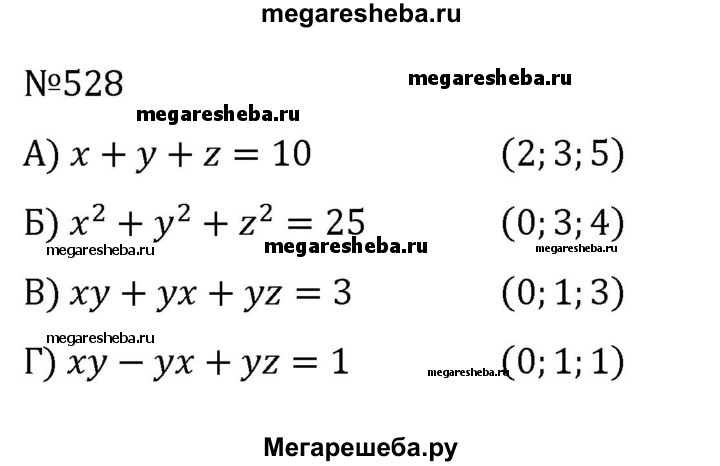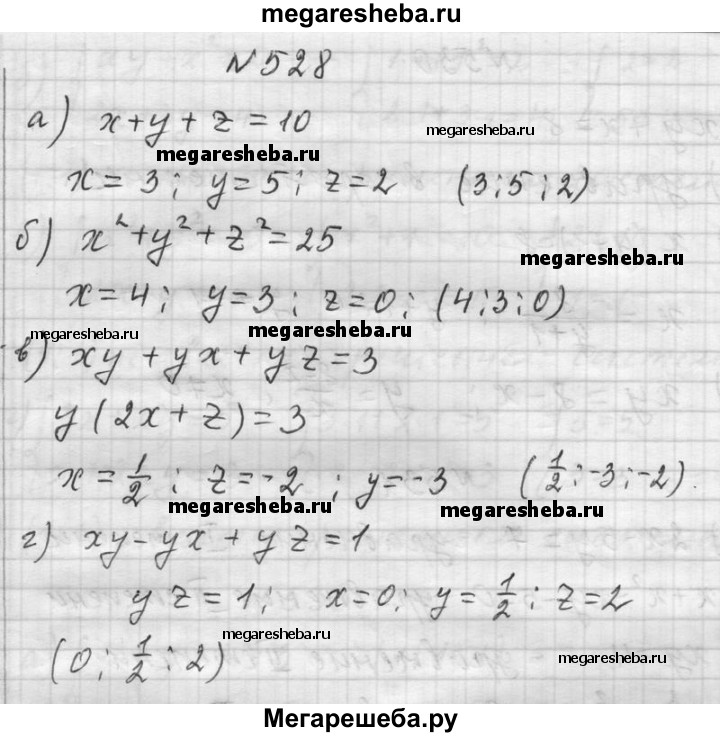 528. Подберите какое-либо решение уравнения: а) х + у + z = 10; б) х2 + у2 + z2 = 25; в) ху + ух + yz = 3; г) ху - ух + yz = 1.