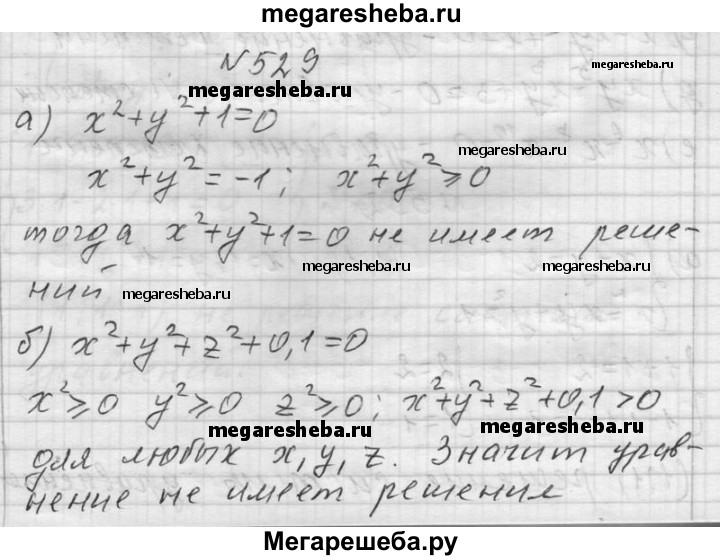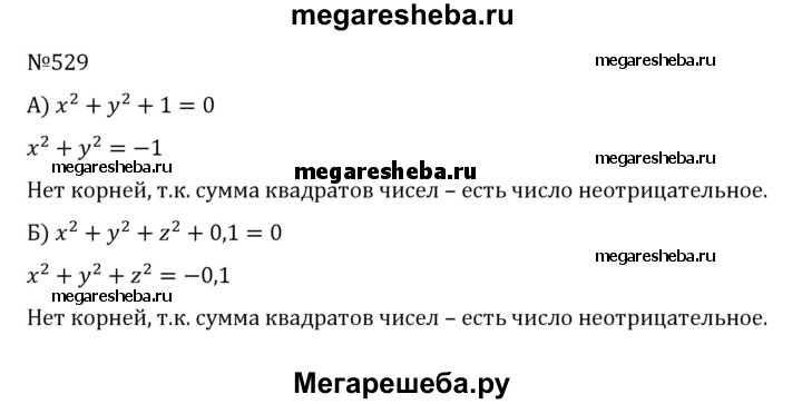 529. Доказываем. Докажите, что уравнение не имеет действительных решений: а) х2 + у2+ 1 = 0; б) х2 + у2 + z2 + 0,1 = 0.