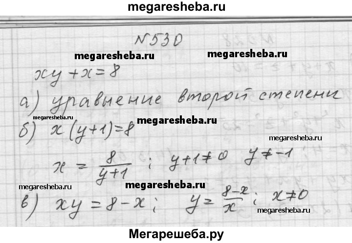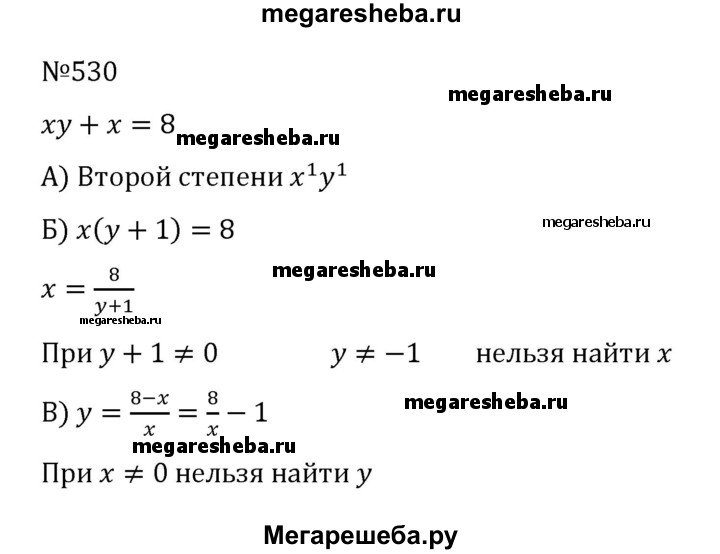 530. Дано уравнение ху + х = 8. а) Какова степень этого уравнения? б) Выразите х через у. Для любого ли у можно найти х? в) Выразите у через х. Для любого ли х можно найти у?