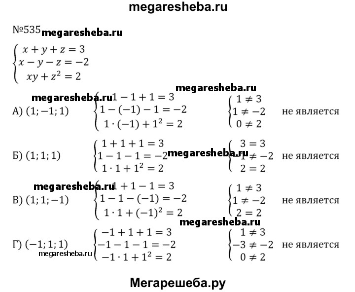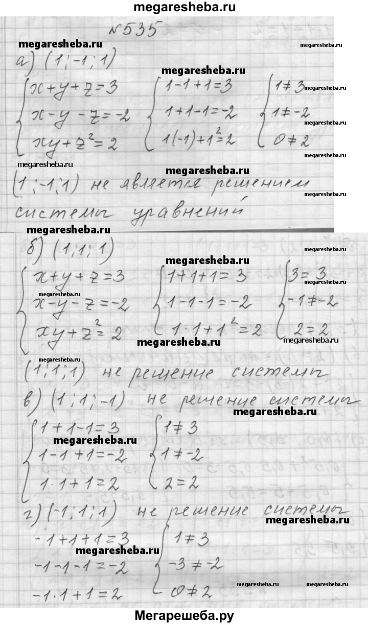 535. Является ли решением системы уравнений тройка чисел: а) (1; -1; 1); б) (1; 1; 1); в) (1; 1; -1); г) (-1; 1; 1)?