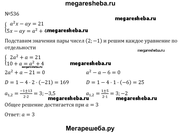 536. Исследуем. При каком значении а пара чисел (2; -1) является решением системы уравнении
