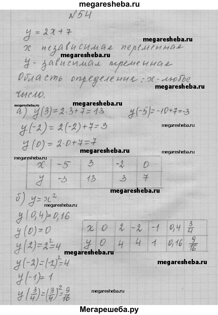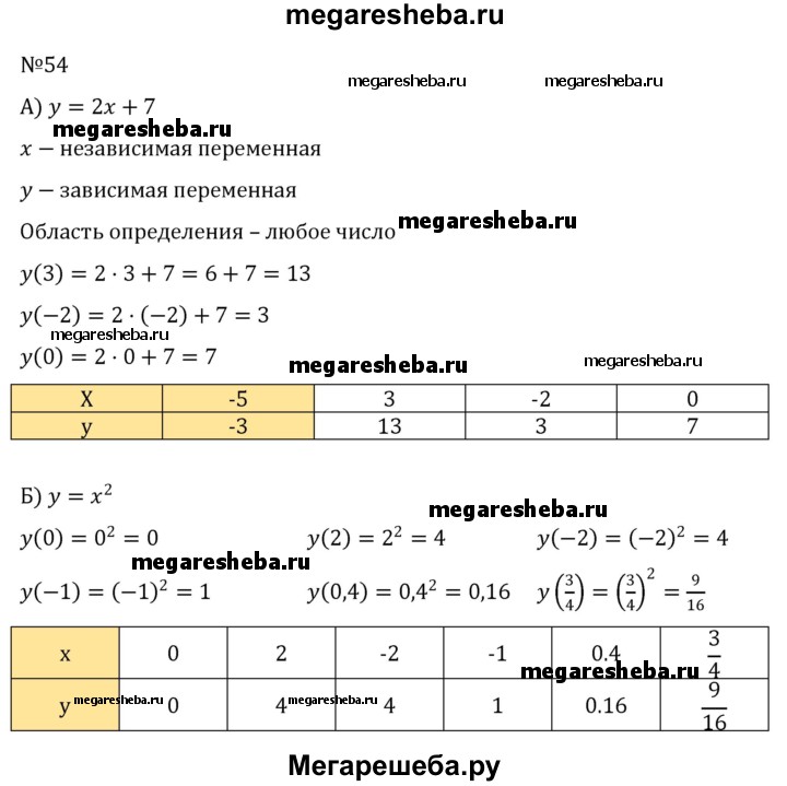 54. а) Функция задана формулой у = 2х + 7. Назовите зависимую и независимую переменные, область определения этой функции. Вычислите: у(3), у (-2), y(0). Результаты запишите в таблицу. Например, если х = -5, то у = 2 * (-5) + 7 = -10 + 7 = -3. б) Функция задана формулой у = х2. Вычислите: у(0), у (2), y (-2), y(-1), у(0,4), у (3/4). Решение оформите в виде таблицы.
