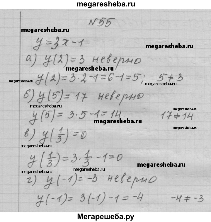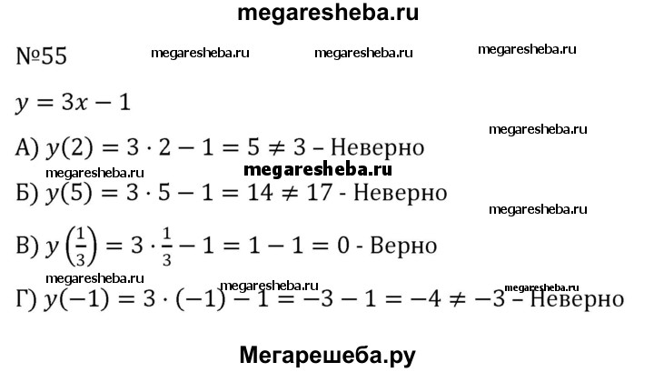 55. Функция задана формулой у = Зх - 1. Верно ли равенство: а) y(2) = 3; б) y(5)=17; в) y(1/3)=0; г) у(-1) = -3?