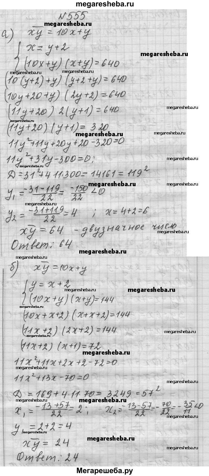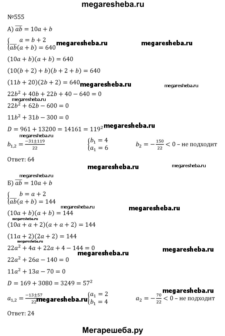 555. а) Найдите двузначное число, если цифра десятков на 2 больше цифры единиц, а произведение числа на сумму его цифр равно 640. б) Найдите двузначное число, если цифра единиц на 2 больше цифры десятков, а произведение числа на сумму его цифр равно 144.