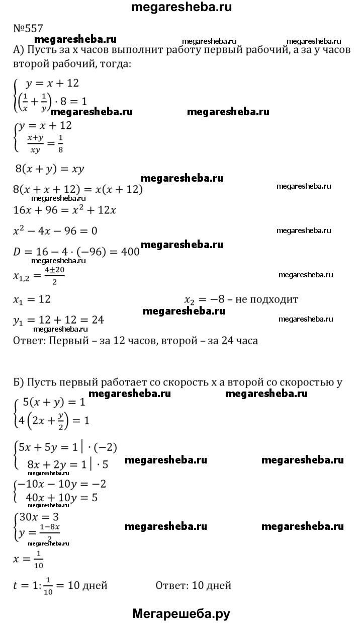 557. а) Двое рабочих, работая вместе, выполняют некоторую работу за 8 ч. Первый из них, работая отдельно, может выполнить всю работу на 12 ч быстрее, чем второй рабочий. За сколько часов каждый из них может выполнить отдельно эту работу? б) Двое рабочих, работая вместе, выполнили всю работу за 5 дней. Если бы первый рабочий работал в два раза быстрее, а второй — в два раза медленнее, то всю работу они выполнили бы за 4 дня. За сколько дней выполнил бы эту работу первый рабочий?