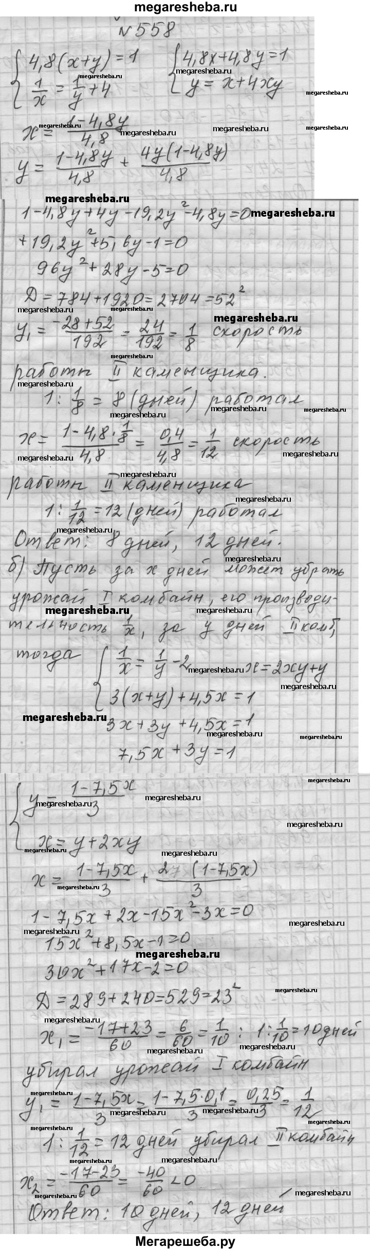 558. а) Два каменщика, работая вместе, могут выполнить работу за 4,8 дня. Второй каменщик, работая отдельно, мог бы выполнить эту работу на 4 дня быстрее, чем первый. За сколько дней каждый каменщик, работая отдельно, мог бы выполнить эту работу? б) На уборке урожая два комбайна работали вместе 3 дня. После этого, чтобы закончить работу, первому комбайну потребовалось ещё 4,5 дня. За сколько дней каждый комбайн в отдельности может убрать весь урожай, если первый, работая отдельно, мог бы провести уборку на 2 дня скорее, чем один второй?