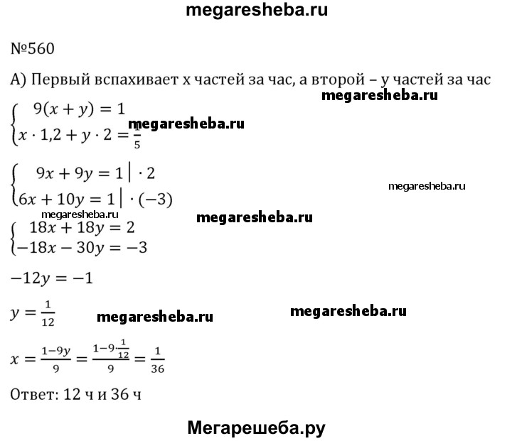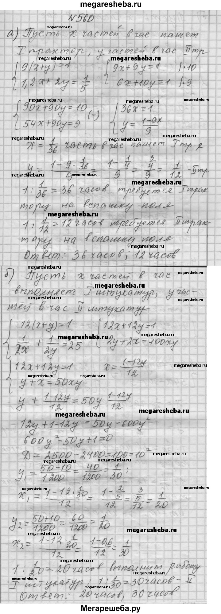 560. а) Два трактора различной мощности могут совместно вспахать поле за 9 ч. Если бы первый трактор работал один 1,2 ч, а затем второй — 2 ч, то было бы вспахано только 20% поля. Сколько часов требуется каждому трактору на вспашку всего поля? б) На выполнение работы двум штукатурам требуется 12 ч. Если бы сначала первый сделал половину работы, а затем другой — оставшуюся часть, то вся работа была бы выполнена за 25 ч. За какое время мог бы выполнить всю работу каждый штукатур в отдельности?