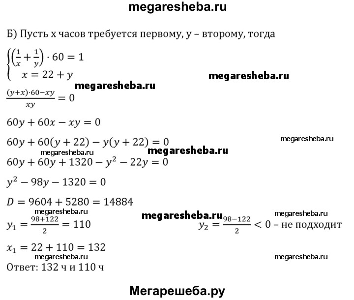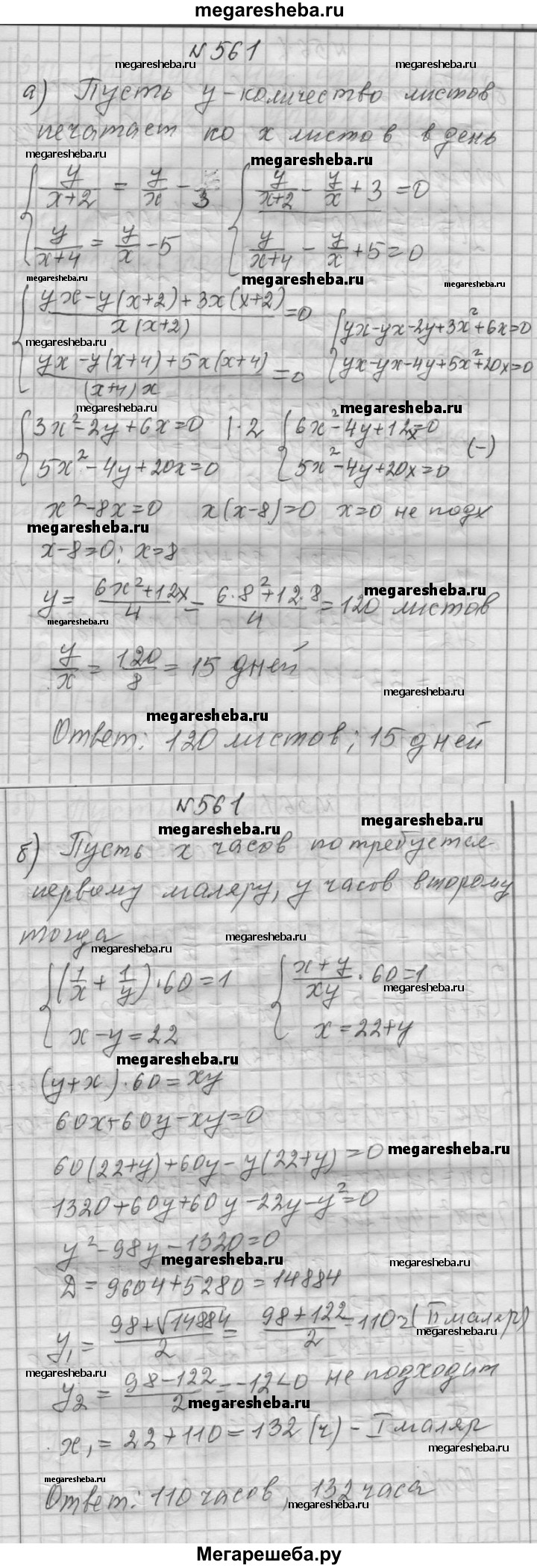 561. а) Машинистка рассчитала, что если она будет печатать ежедневно на 2 листа больше установленной нормы, то окончит работу раньше намеченного срока на 3 дня. Если же она будет печатать в день на 4 листа больше установленной нормы, то окончит работу на 5 дней раньше срока. Сколько листов требовалось напечатать машинистке и в какой срок? б) Два маляра могут окрасить стены цеха за 60 ч. Найдите время, которое потребуется каждому из них для выполнения этой же работы отдельно, если известно, что одному из них потребуется на 22 ч больше, чем другому.