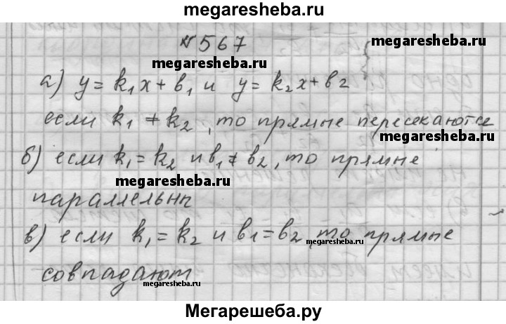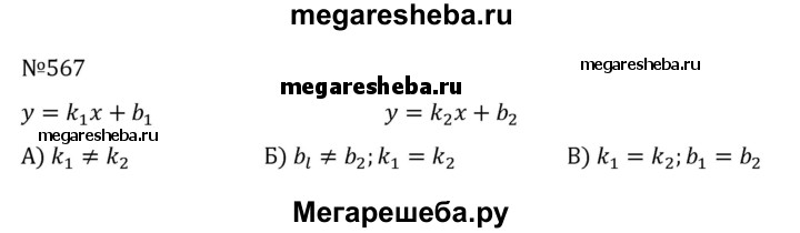 567. Какому условию должны удовлетворять числа k1, k2, b1 и b2, чтобы прямые у = k1x + b1 и у = k2x + b2: а) пересекались; б) были параллельны; в) совпадали?