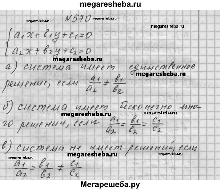 570. Какому условию должны удовлетворять отличные от нуля числа a1, a2, b1, b2, c1, c2, чтобы система уравнений а) имела единственное решение; б) имела бесконечно много решений; в) не имела решений?