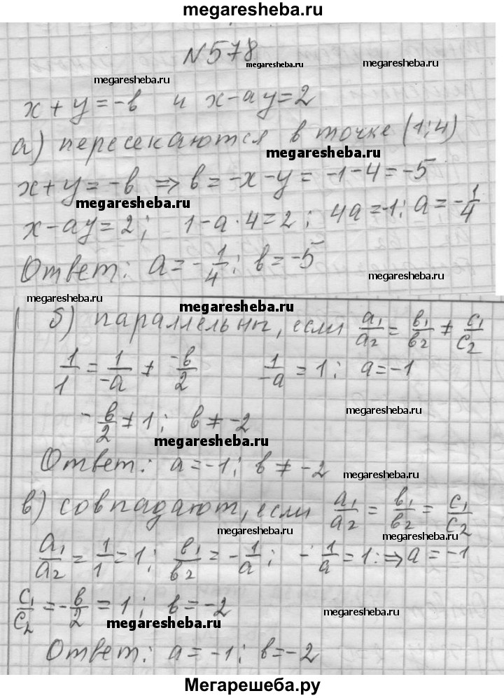 578. При каких а и b прямые x + у = -b и x - ау = 2: а) пересекаются в точке (1; 4); б) параллельны; в) совпадают??