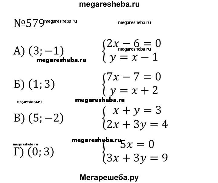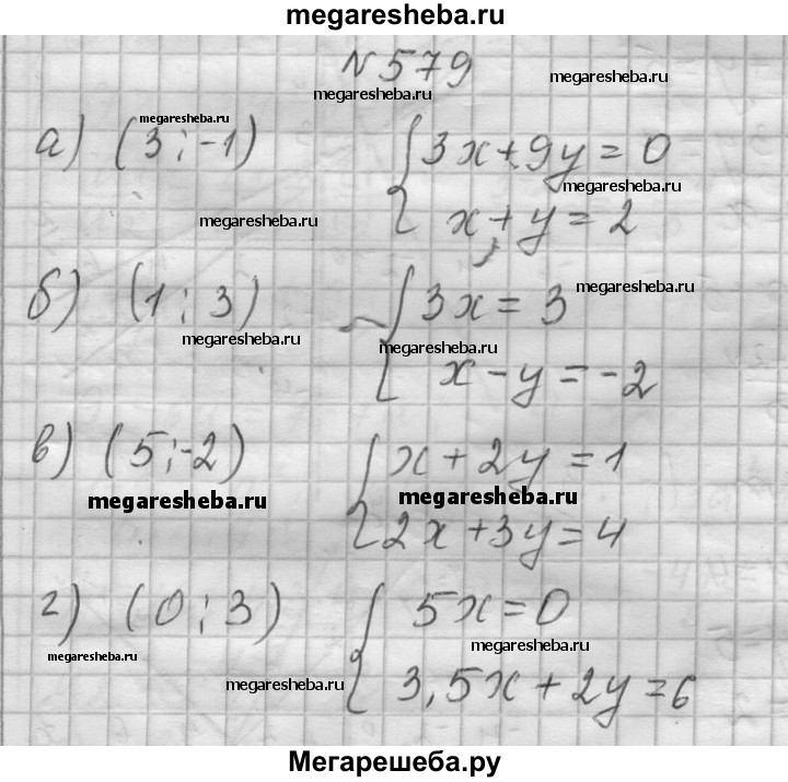 579. Составьте систему уравнений, решением которой является пара чисел: а) (3; -1); б) (1; 3); в) (5; -2); г) (0; 3).