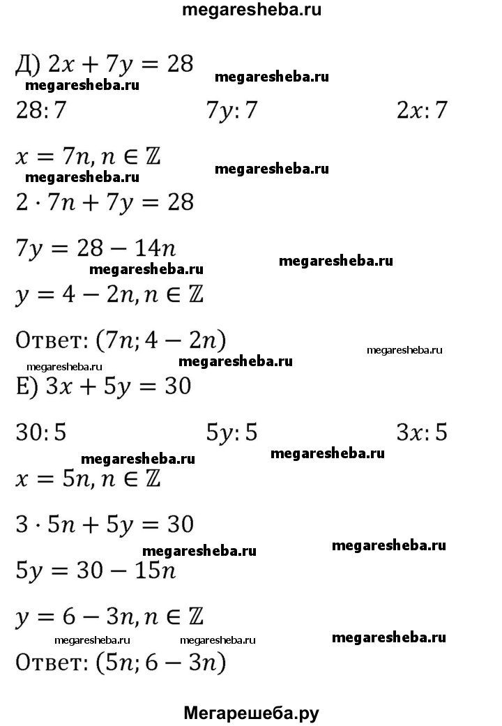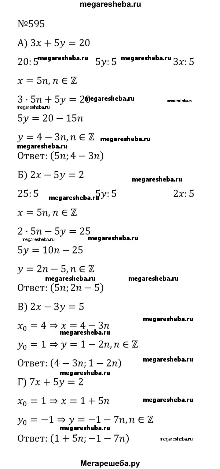 595. Решите уравнение в целых числах: а) Зх + 5у = 20; б) 2х - 5у = 25; в) 2х - 3у = 5; г) 7х + 5у = 2; д) 2х + 7у = 28; е) Зх + 5у = 30.