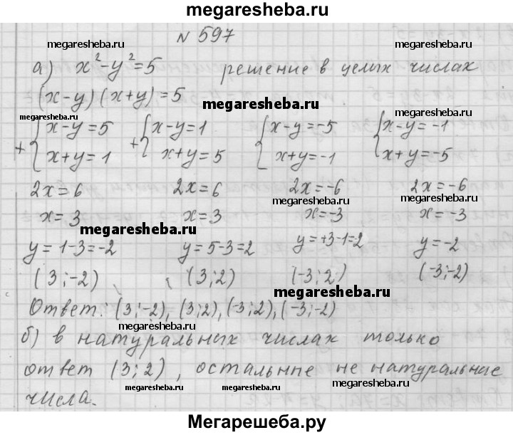 597. Решите уравнение х2 - у2 = 5: а) в целых числах; б) в натуральных числах.