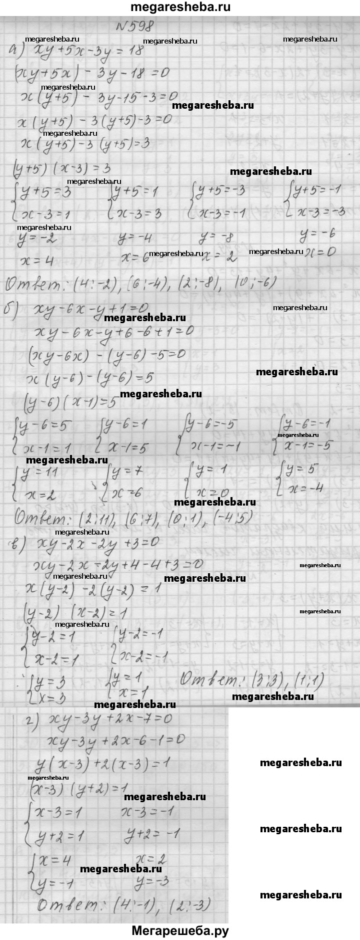 598. Решите уравнение в целых числах: а) ху + 5х - Зу = 18; б) ху - 6х - у + 1 = 0; в) ху - 2х - 2у + 3 = 0; г) ху - Зу + 2х - 7 = 0.
