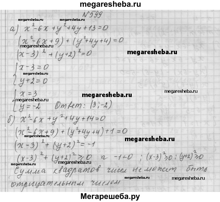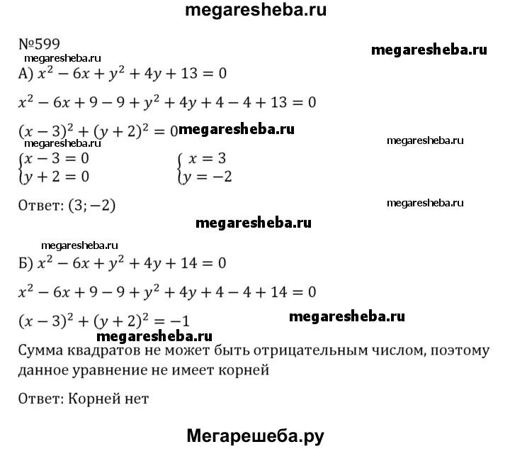 599. Доказываем, а) Докажите, что уравнение х2 - 6х + у2 + 4у + + 13 = 0 имеет единственное целочисленное решение. б) Докажите, что уравнение х2 - 6х + у2 + 4у + 14 = 0 не имеет решений.