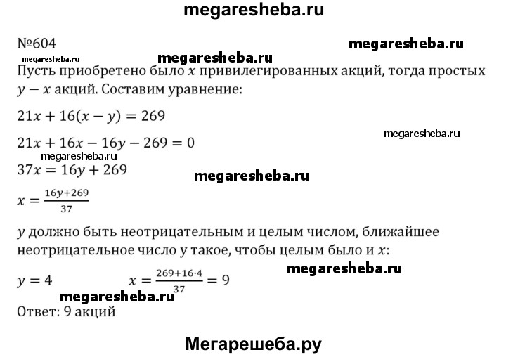 604. Иван Петрович приобрёл в начале года k акций банка «Надежда», часть из которых — простые, а другая часть — привилегированные. За год доход по одной простой акции составил 16 условных денежных единиц, а доход по одной привилегированной акции — 21 условную денежную единицу. Сколько привилегированных акций купил Иван Петрович, если доход за год по купленным акциям составил 269 условных денежных единиц?