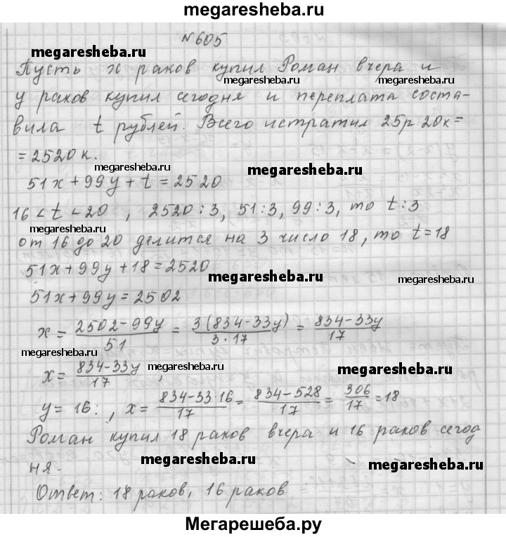 605. Купил Роман раков: вчера мелких — по цене 51 к. за штуку, а сегодня — по 99 к., но очень крупных. Всего на раков он истратил 25 р. 20 к., из них переплаты из-за отсутствия сдачи в сумме составили от 16 до 20 к. Определите, сколько раков купил Роман вчера и сколько сегодня.