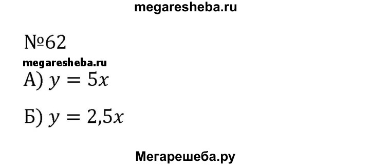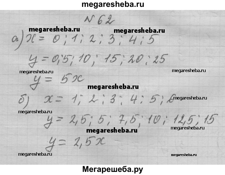 62. Какой формулой может быть задана функция, если: а) значениям х, равным 0, 1, 2, 3, 4, 5, соответствуют значения у, равные 0, 5, 10, 15, 20, 25; б) значениям х, равным 1, 2, 3, 4, 5, 6, соответствуют значения у, равные 2,5, 5, 7,5, 10, 12,5, 15?